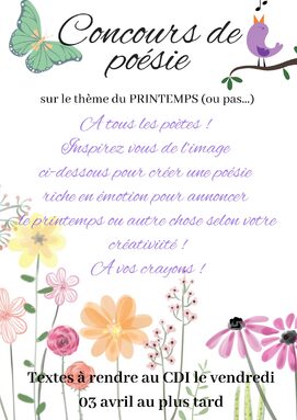 As-tu l'âme d'un poète ? C'est ce que les Ambassadeurs du CDI voudraient savoir ! C'est pourquoi ils te proposent de t'essayer à l'écriture de poèmes ! Pour cela, regarde l'affiche en page 2 et laisse-toi guider par ton imagination !